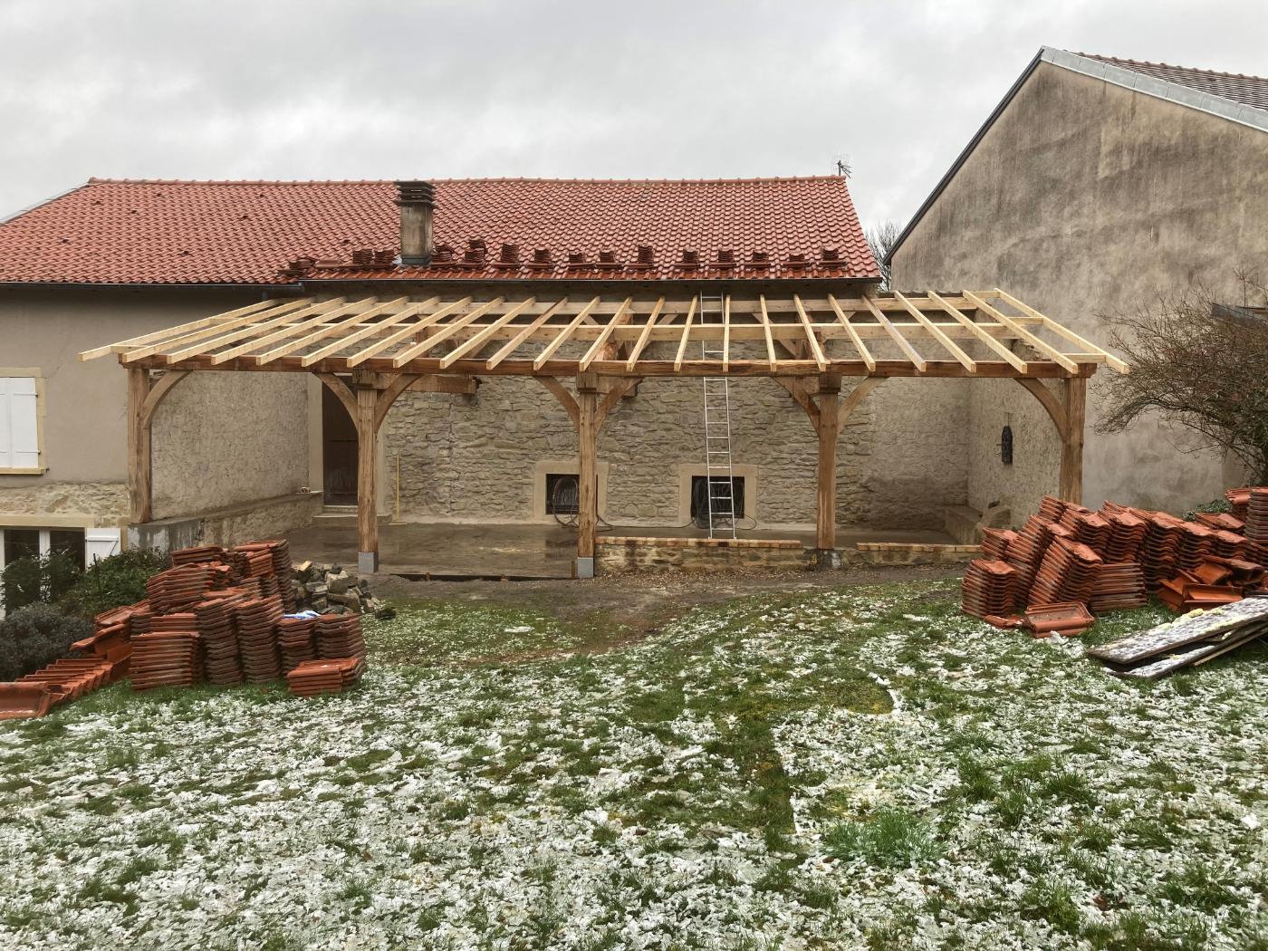 Création d’un auvent contre une habitation existante, poteaux et ferme en chêne, pannes et chevron sapin. Notre client souhaitait créer un espace ouvert sur son jardin, un lieu de plénitude pour se relaxer et profiter du calme qui lui était offert. Cet ouvrage tout en simplicité, est un compromis entre la robustesse du chêne et la flexibilité du Sapin, un mélange complémentaire et rationnel qui se conjugue très bien pour ce projet.