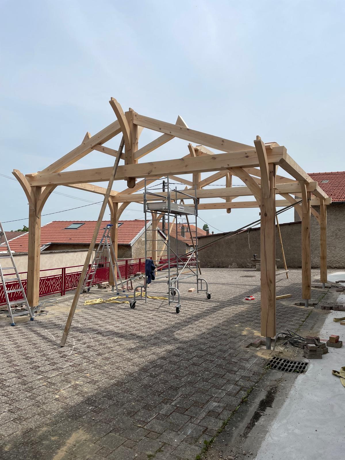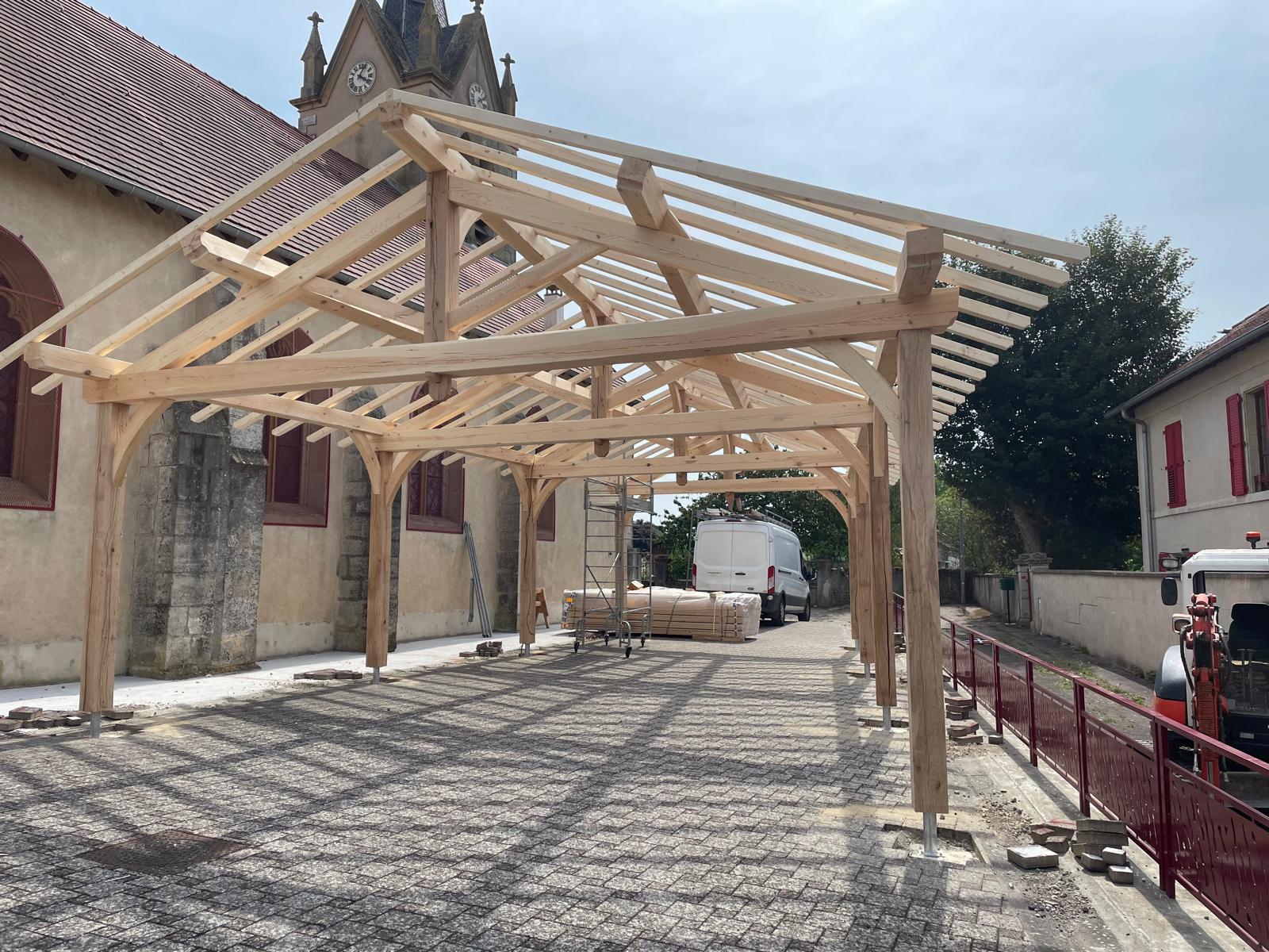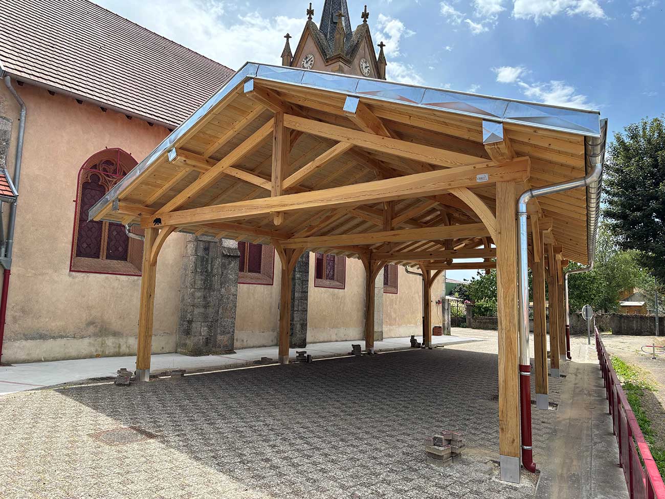 Création d’un auvent traditionnel sur une place à coté de l’église de Thimonville.