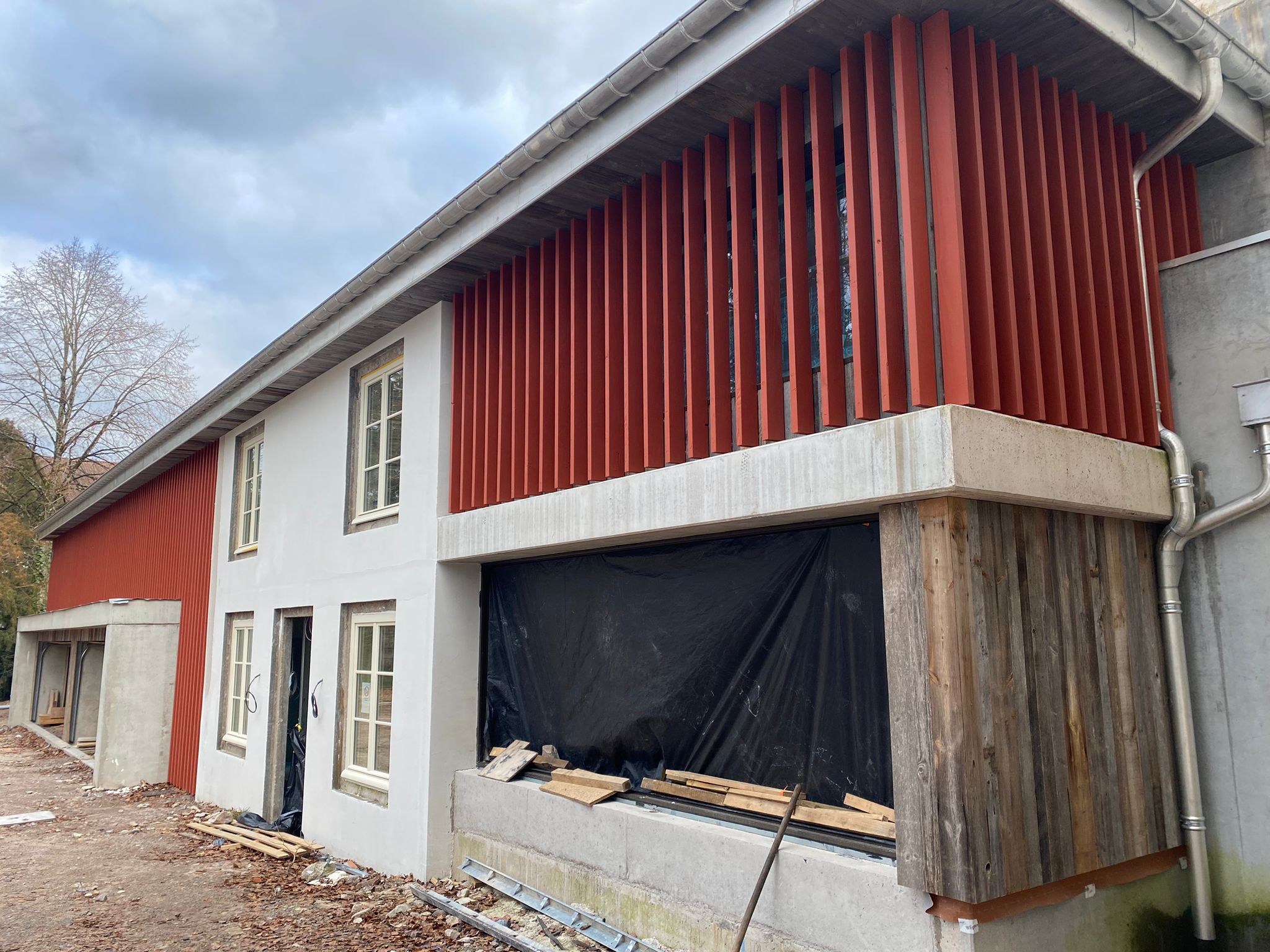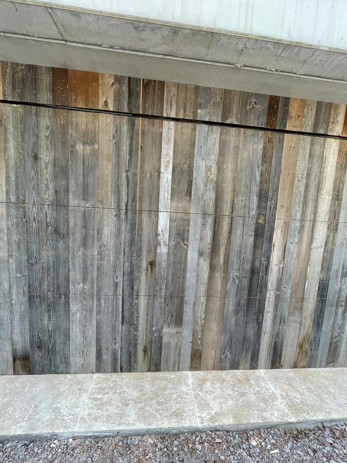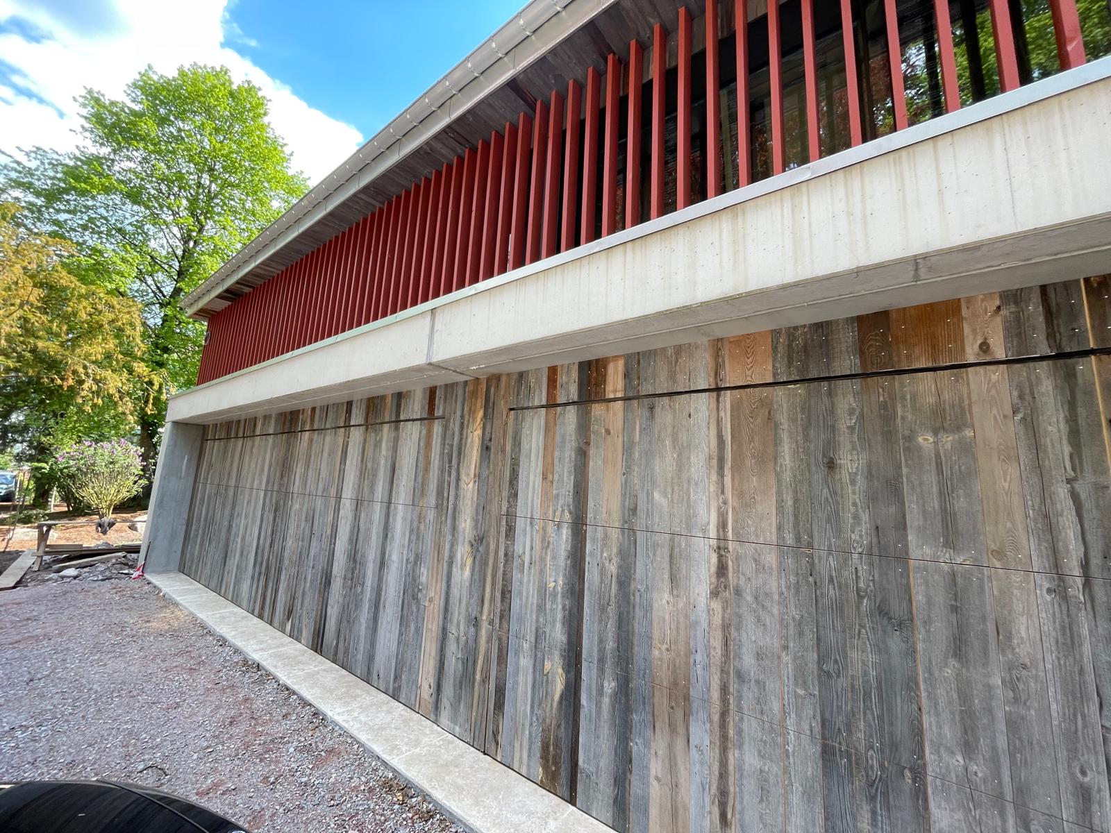Pose d’un bardage et de sous face sur une habitation, avec épine afin de donner du relief à la façade. Bardage en vieux Sapin brossé, et épines en douglas brossé et peintes. Les portes de garage sectionnelles ont également été bardées, ainsi qu’une porte d’accès à une buanderie, qui se fond avec la trame de l’ensemble. Chantier avec un calepinage sur mesure et une finition authentique qui donne vie à la façade.