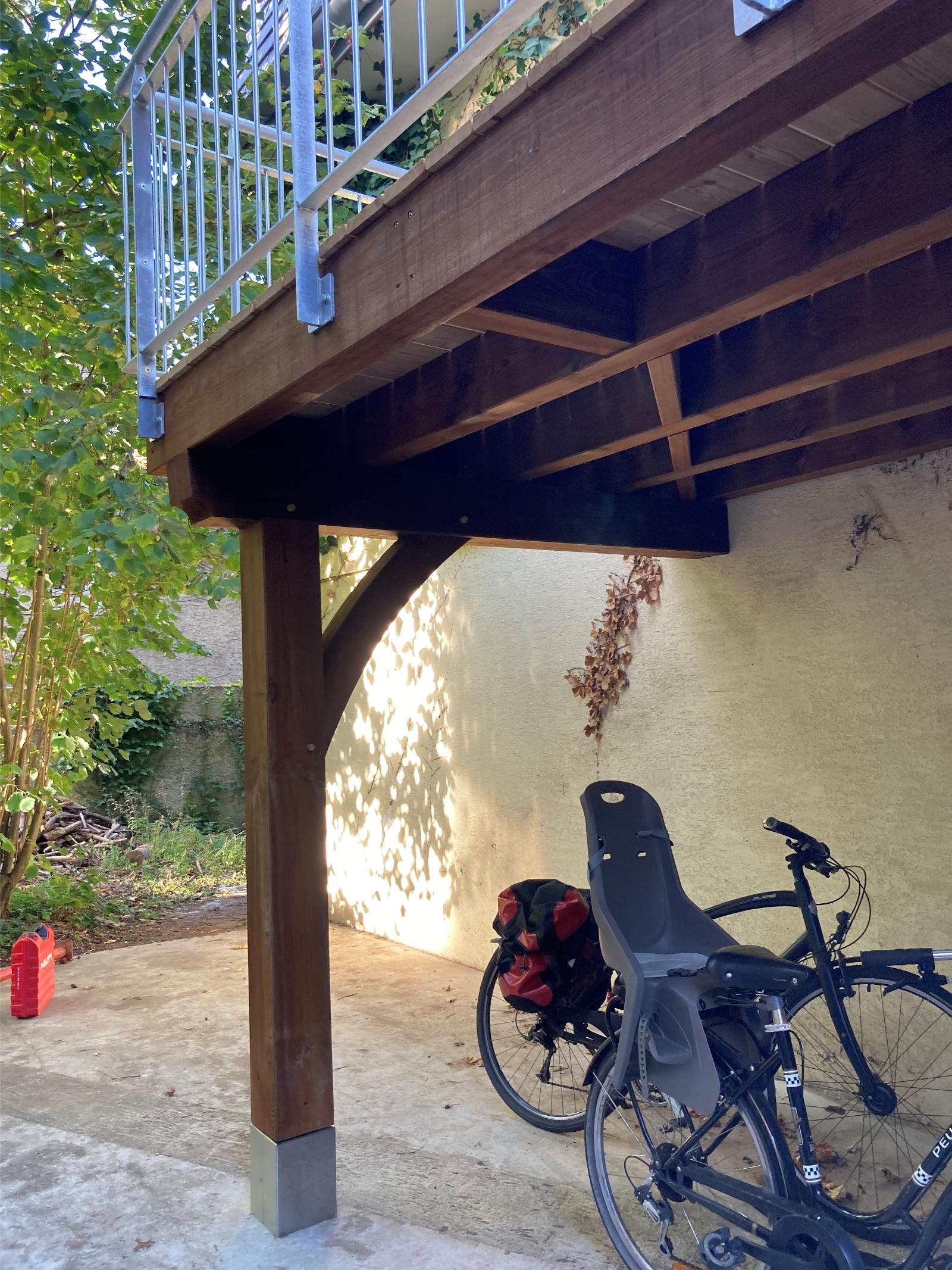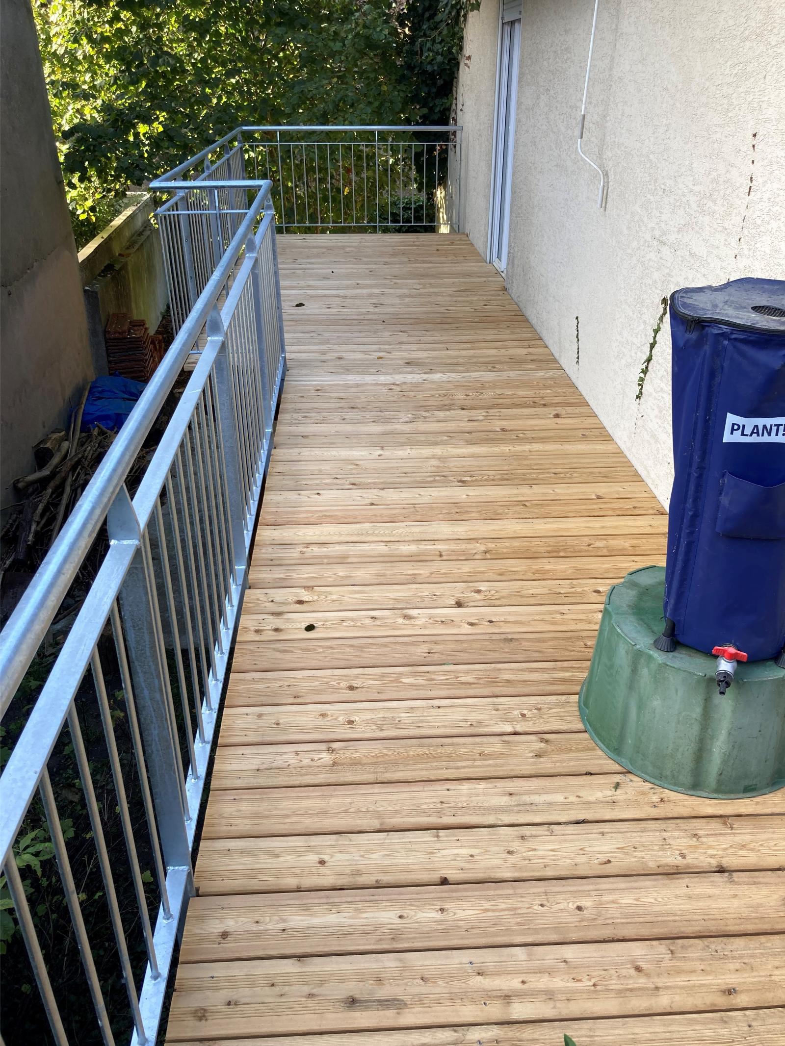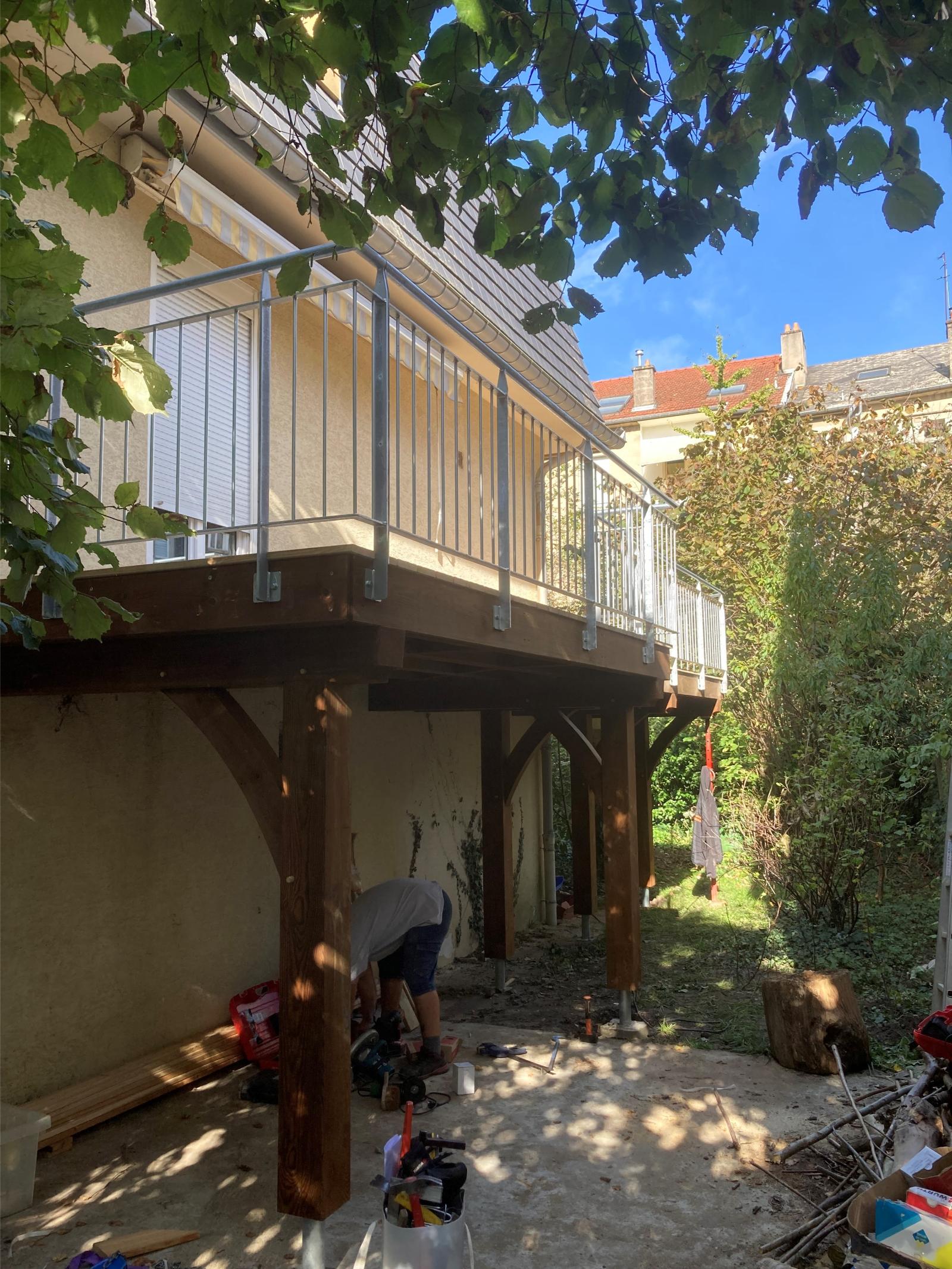 Remplacement d’une terrasse sur poteau, avec garde-corps métallique galvanisé fabriqué sur mesure par RBJ métallerie suivant nos plans.