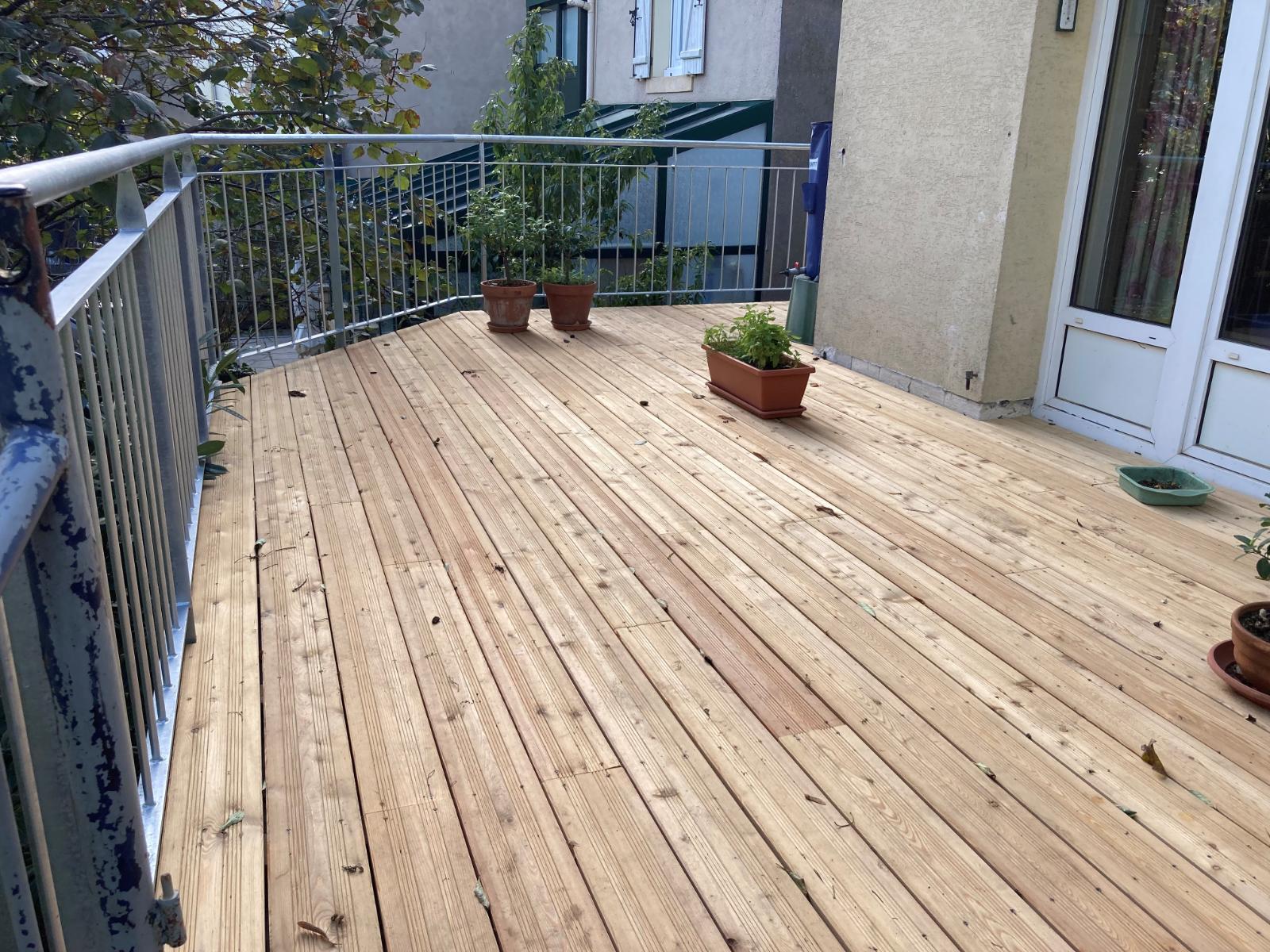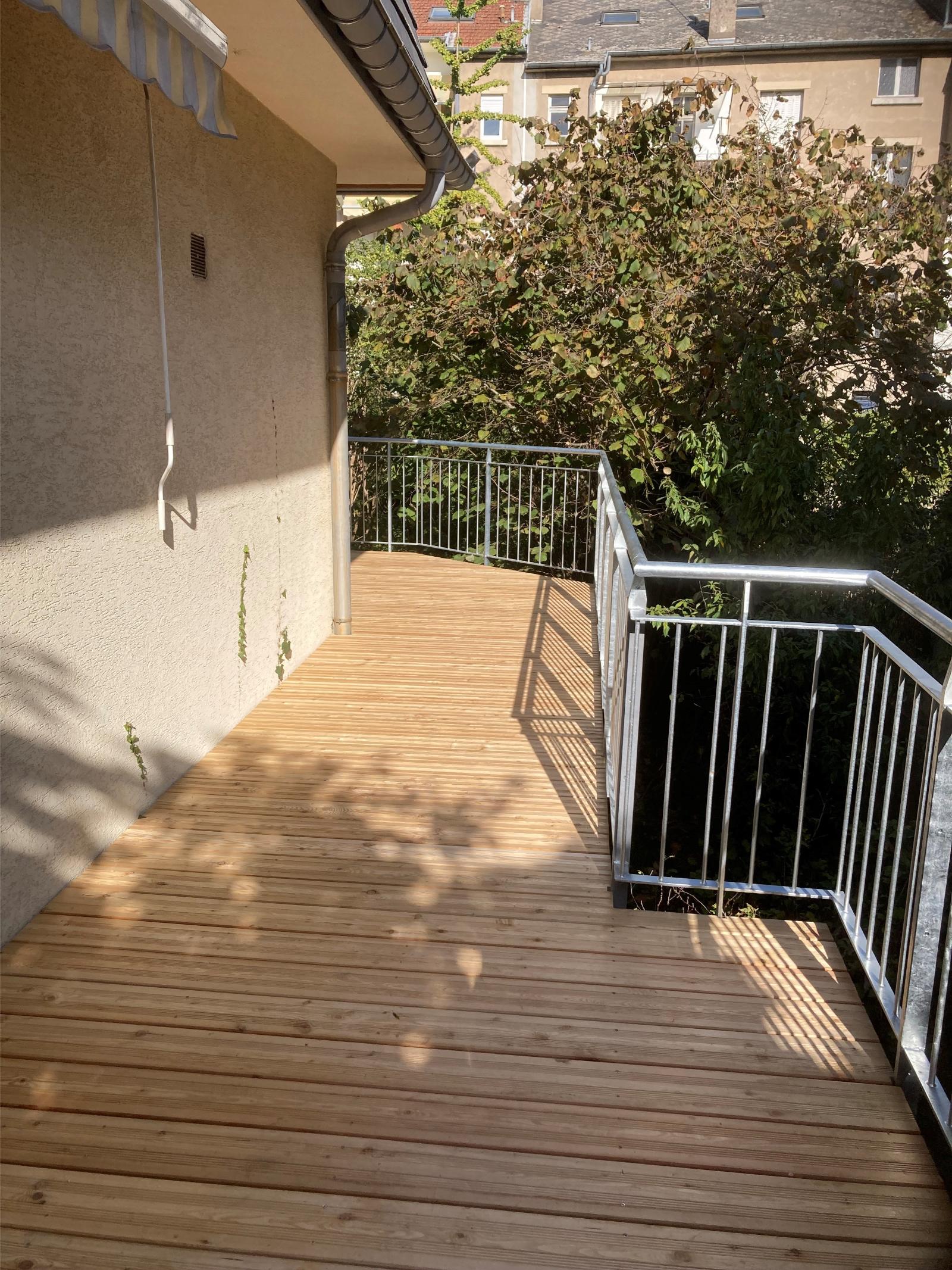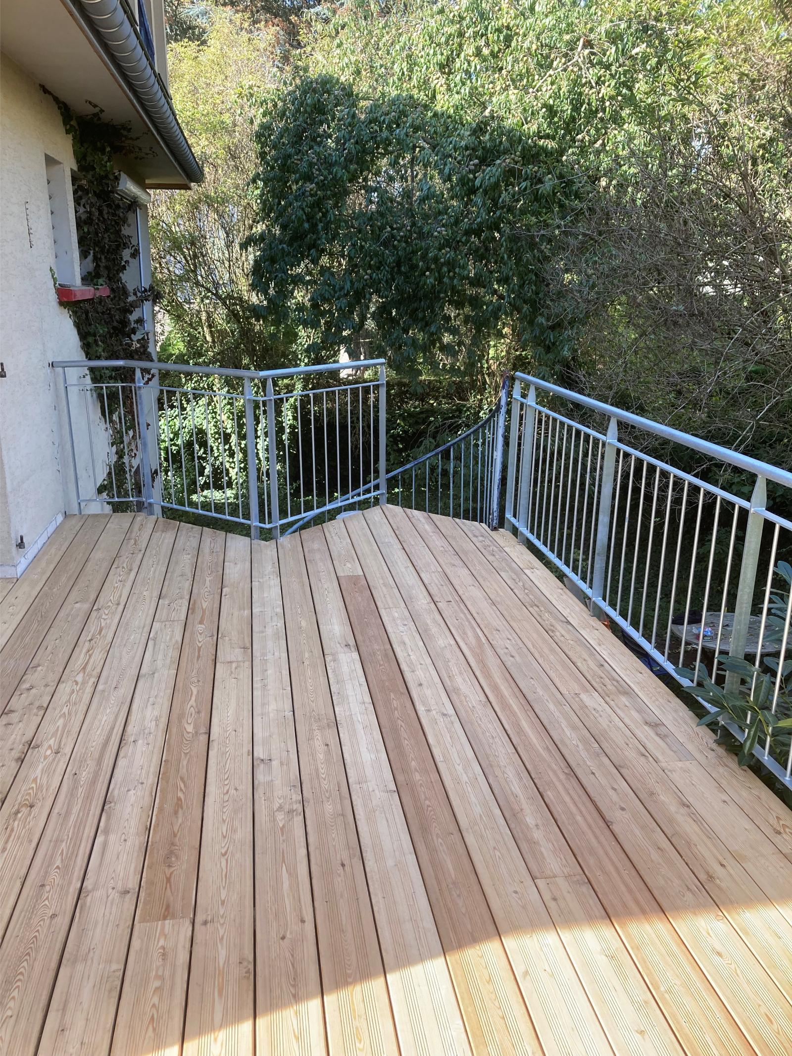 Remplacement d’une terrasse sur poteau, avec garde-corps métallique galvanisé fabriqué sur mesure par RBJ métallerie suivant nos plans.