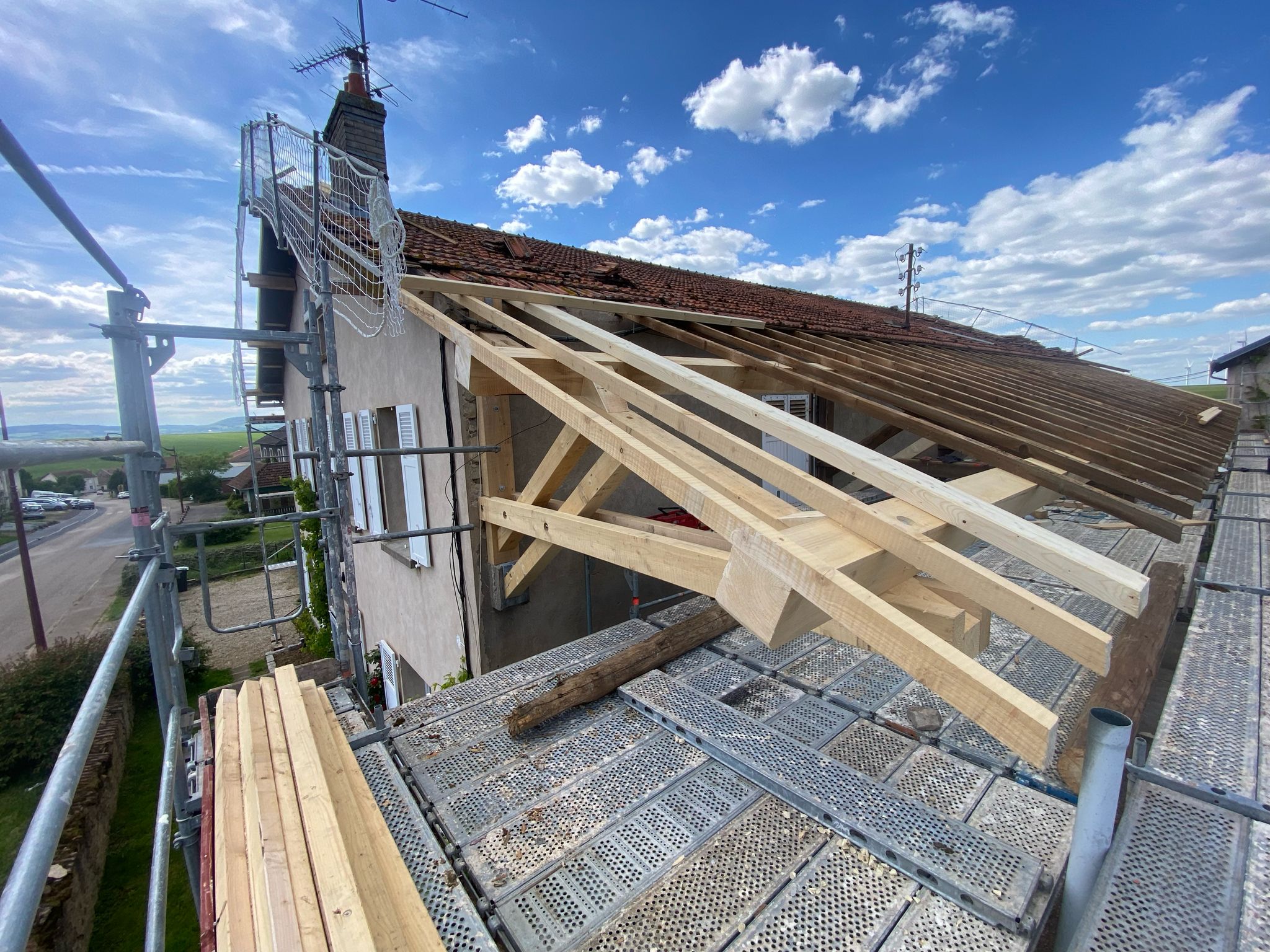 Rénovation d’une charpente existante en partie conservée sur un corps de ferme, avec des débords de toit importants sur une des façades. Après expertise de la structure existante, certains éléments de la charpente ont été remplacés, renforcés et d’autres sont restés en place, afin de recevoir une nouvelle couverture. Le savoir-faire de notre équipe a été crucial pour renforcer et modifier la structure existante, en adaptant les nouveaux bois à cet ensemble et lui offrir de nouvelles perspectives.